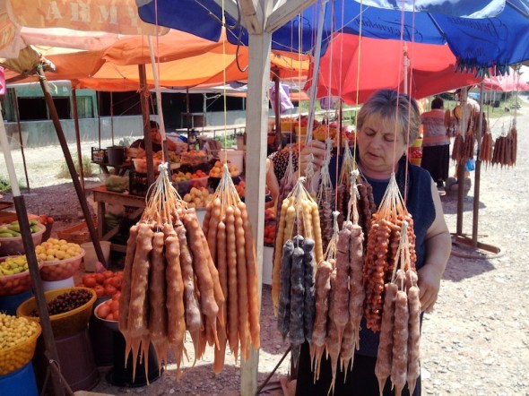 Food and drink: I’ve already made much mention of the food and wine – it’s excellent. However, beware the prevalence of cheese! Cheese, bread, AND khachapuri will be served at every meal, as will cucumber-tomato salad. Other dishes to try are badrijani nigvzit, eggplant slices smeared with a delicious walnut paste, pkhali, or vegetables mashed with walnut paste, kharcho, a delicious hearty and well-spiced beef soup, chakapuli, a lamb and green-plumb stew, tabaka, a whole small chicken flattened then grilled or fried, and mchadi, a delicious fried cornbread. Beans are very popular, whether served as lobio, a bean stew not unlike refried beans, or lobiani, like a khachapuri but stuffed with beans instead of cheese. Make sure to order a side of tqemali, or sour plum sauce, eaten with everything but especially grilled meat. Various pickles and greens also make a good accompaniment to a meal. The most popular dessert and travellers’ snack, nicknamed “Georgian Snickers,” is churchkhela, a string of walnuts dipped repeatedly into boiled grape juice concentrate and left to dry.